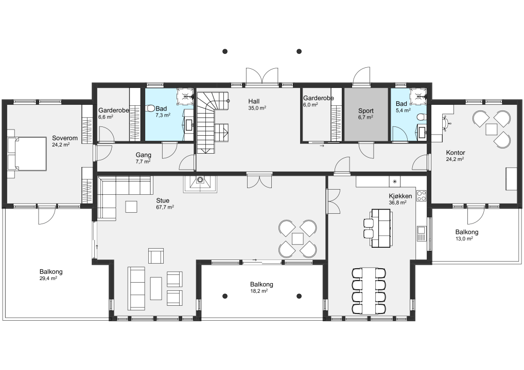 Boligen har seks soverom, seks bad, trimrom, stort kontor, tre stuer, en romslig kjøkkenløsning og uteområder som kan nytes uansett hvilken etasje du befinner deg i. Walk-in garderober og praktisk vaskerom sørger for orden i det daglige.